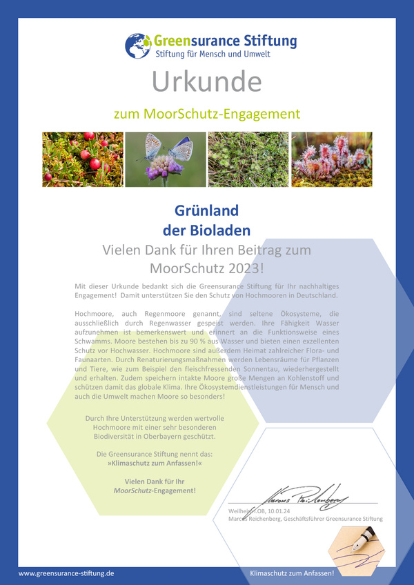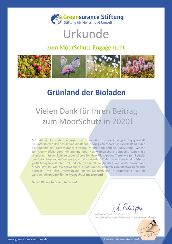 In Zusammenarbeit mit unserem Ökokistenverband stellen wir seit 2019 eine CO2-Bilanz auf und gleichen das Ergebnis unseres unvermeidbaren CO2-Ausstosses aus. Bis 2021 haben wir über die Greensurance-Stiftung sowohl Emmissionen nach dem Gold-Standard ausgeglichen, als auch einen Teil über eine Moorpatenschaft.