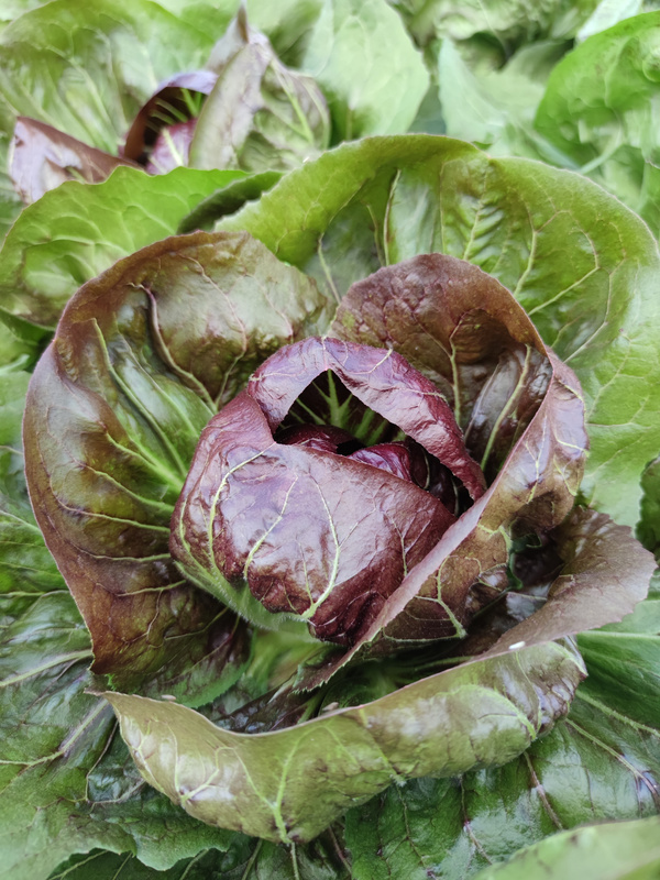 Steht hier einträchtig mit den Salaten zusammen, braucht allerdings noch. Macht optisch schon was her, aber die Köpfe sind noch zu locker aufgebaut.