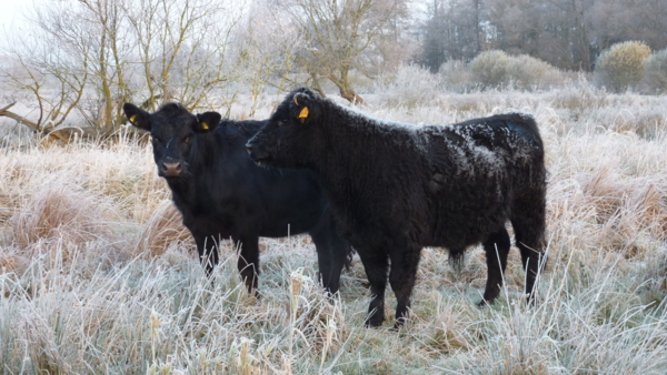 Angus-Gallowayrinder auf der Winterweide im Raureif