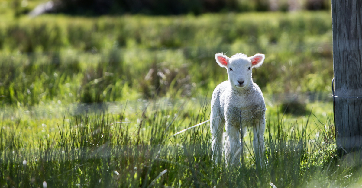 KI generiert: Ein Lamm steht auf einer grünen Wiese neben einem Holzpfosten.