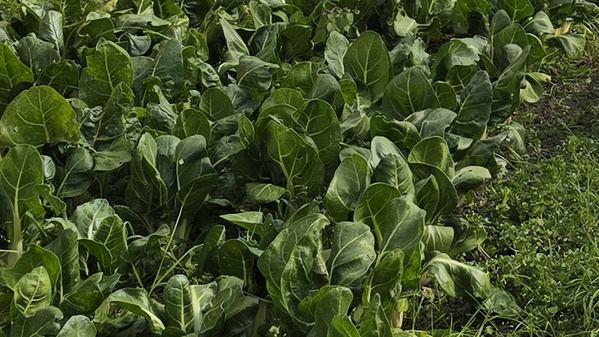 KI generiert: Ein Feld mit grünen Blattgemüsen, wahrscheinlich Mangold, dicht bewachsen.