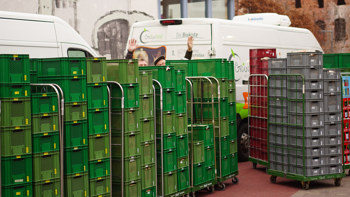 Rollis mit Biokisten vor Lieferfahrzeugen