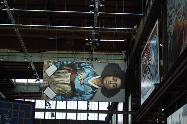 Ausstellungsobjekt Street Art Museum Amsterdam Frauenporträt japanische Kleidung quergehangen
