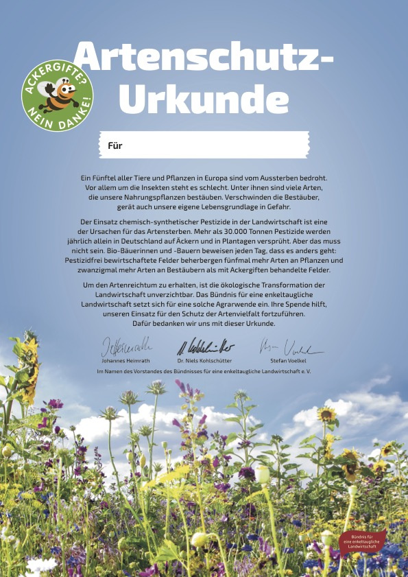 Mach dir oder anderen eine Freude und setze dich gleichzeitig für unsere Artenvielfalt ein! Mit dem Erwerb einer der Artenschutz-Urkunden und der damit verbundenen Spende hilfst du dem Bündnis, seine Arbeit gegen chemisch-synthetische Pestizide und für eine ökologische Transformation der Landwirtschaft fortzuführen.