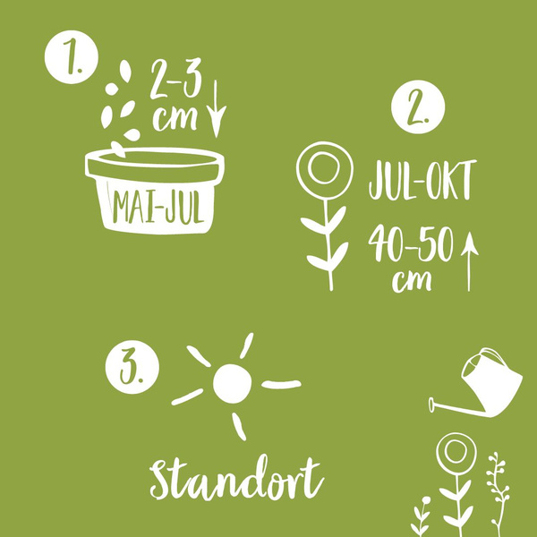 Von Mai bis Juli könnt ihr die Blumensaat in die Erde bringen. Das kann im Blumentopf oder im (Blumen)beet sein, gerne in Gesellschaft anderer Pflanzen. Samenkörner bitte 2-3 cm tief einlegen und feucht halten.