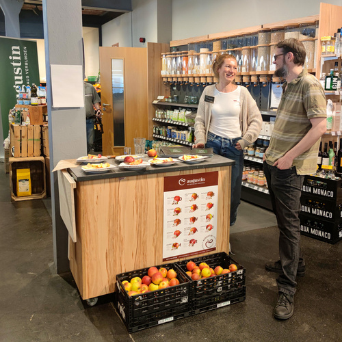 Im angeregten Austausch: Catharina Augustin von Bio-Obst Augustin mit Frischespezialist Dirk.