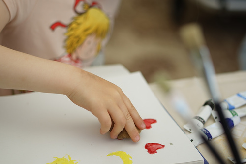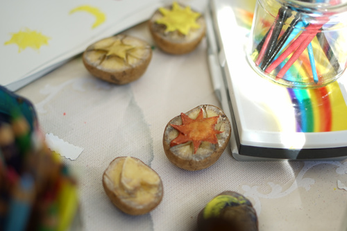 Wir bauen wieder unser kleines Spiel-Tipi auf und wollen Kartoffel-Drucken.