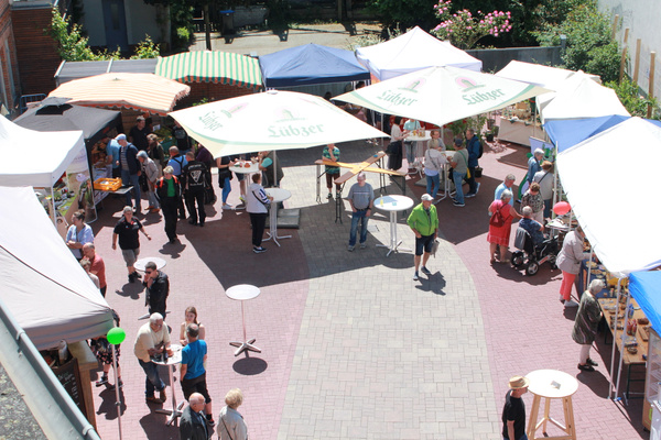Ein kleiner Blick vom Dach auf einen Teil unseres Hofes mit den Ausstellern und ihren Ständen.