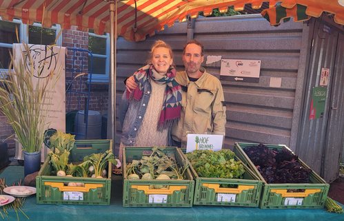 Philipp vom Hof Brummelkamp (später auch noch auf unserer Bühne) mit Freundin und erstem Freiland-Gemüse.