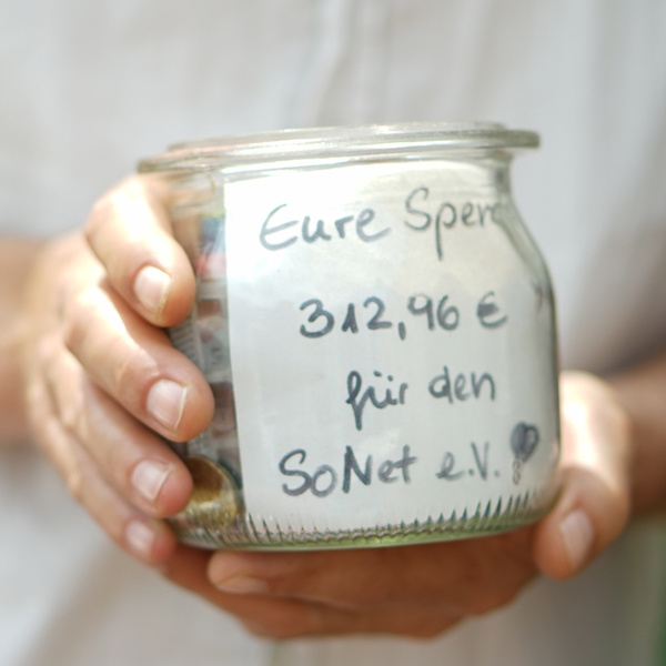 In diesem Jahr gehen Eure Spenden fürs Kinderschminken und das Glücksrad-Drehen an den SoNet e.V., "Soziales Netzwerk für weltoffene und demokratische Kinder-, Jugend- und Sozialarbeit". Heute konnten wir das Spendenglas an Cathleen übergeben.