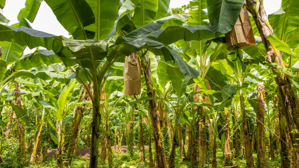 198 Bananen-Produzentenorganisationen in 18 Ländern bauen Bananen nach Fairtrade-Standards an. Die Plantagen liegen oft in abgelegenen Regionen. Die Finca Girasol von Christoph liegt zwei Stunden westlich der Hauptstadt Santo Domingo. Die Bananen, die oft mit mit Macheten vom Baum geschnitten werden, werden sorgfältig gesäubert, mit Labeln versehen und für die Schiffsreise verpackt. Die Bananenstauden werden vor der Ernte normalerweise durch blaue Plastikbeutel gegen mechanische Schäden geschützt, speziell gegen Kratzer durch die harten Blätter der Bäume. Solche Schäden sind später als längliche braune Streifen auf den Bananen erkennbar. Einige Fincas, wie eben auch Christophs, experimentieren inzwischen mit dem plasikfreien Anbau.