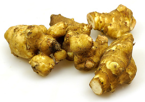 Die Knollen der Topinambur pflanze sind in Ihrer Größe mit kleineren Kartoffeln vergleichbar ähneln ansonsten aber eher der Ingwerknolle.