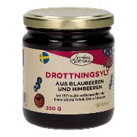 Drottningsylt ist eine intensiv schmeckender Fruchtaufstrich aus Himbeeren und schwedischen Waldblaubeeren.Der Fruchtaufstrich aus Blaubeeren und Himbeeren ist eine der beliebtesten Fruchtaufstrichmischungen in Schweden, genannt  Drottningsylt. Diese wunderbar fruchtige Mischung, sowohl süß als auch leicht säuerlich, eignet sich perfekt für Pfannkuchen, Backwaren und natürlich als Aufstrich.Das Sylt besteht zu gleichen Teilen aus Waldblaubeeren und Waldhimbeeren. Das Verhältnis zwischen den beiden Beeren ist perfekt und verleiht der Sylt einen einzigartig kraftvollen und herrlich ausgewogenen Geschmack.Blaubeersträucher, die manchmal auch als Zwergbäume klassifiziert werden, sind eine der häufigsten Pflanzen in Schweden. Die schwedischen Waldböden sind zu etwa 11% mit Blaubeeren bedeckt.Die Himbeere, im Schwedischen Hallon genannt, hat eine sehr sagenumwobene Namensgeschichte. Der Name Himbeere geht wohl aus der althochdeutschen Bezeichnung Hintperi hervor, durch Lautangleichung. "Hind" stammt dabei aus dem Altnordischen und bedeutet "Hirschkuh". Himbeere bedeutet also auch "Beere der Hirschkuh"."Drottning" heißt übersetzt "Königin". Das Drottningsylt übersetzt heißt "Königinnensylt". Woher das Sylt diesen Namen hat, ist leider nicht mehr bekannt. Sicher ist jedoch, dass die Mischung schon 1903 in dem Kochbuch "Hemmets Kokbok" zu finden war. Das perfekte Gleichgewicht der Beeren ist außerdem jeder Königin würdig.