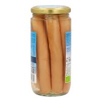 Die Verarbeitung des hochwertigen Bio-Fleisches und der geschmackvollen Bio-Gewürze erfolgt nach strengen Qualitätsrichtlinien. Auf Zusatzstoffe wie z.B. Nitritpökelsalz oder Phosphate verzichten wir aus Überzeugung. Die Würstchen sind in Eigenhaut, dies bedeutet, dass die Wurstmasse zu Beginn in einen Cellulosedarm gefüllt wird. Im Verlauf der Produktion mit dem Brühen und Räuchern bildet sich an der Oberfläche eine Eiweißschicht, der Darm wird vor dem Abfüllen in das Glas entfernt und fertig ist das Würstchen in zarter EIgenhaut.  Laktosefrei, Glutenfrei.