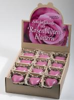 Schafmilchseife Herz Rose pink mit Rosenblütenblättern im Verkaufsdisplay mit beiliegenden Papiertütchen, 65g, BDIH zertifiert