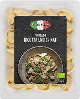 Teig (70%): HARTWEIZENGRIESS*, Wasser, WEIZENGLUTEN*, Kurkuma*, Tomatenpulver*.Füllung (30%): RICOTTA*, Spinat*, Kartoffelflocken*, VOLLMILCH*,