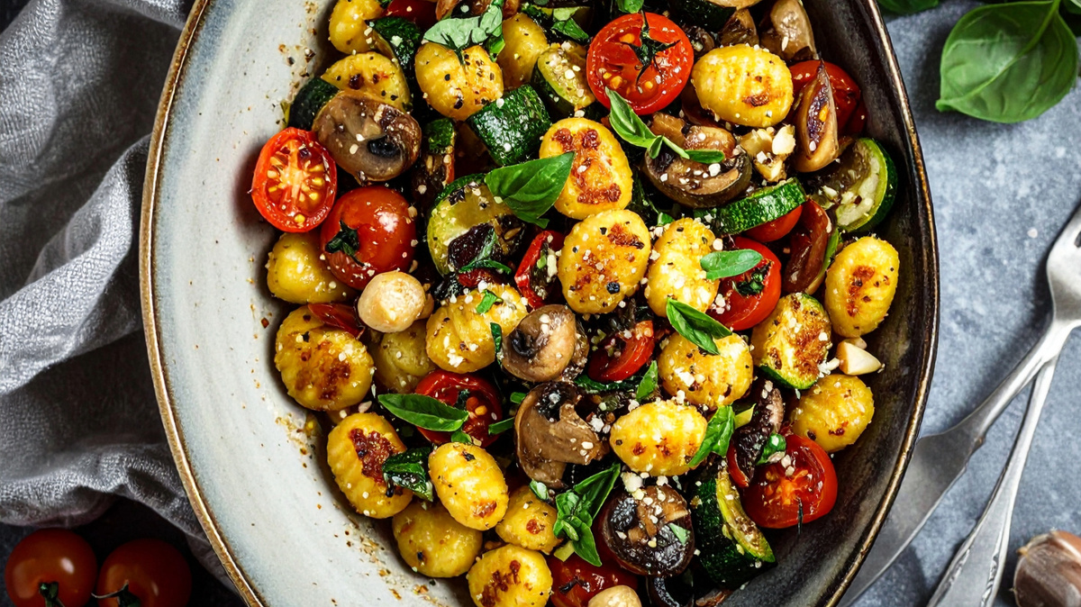 Mit Tomatenmark verfeinern und großzügig mit Salz, Pfeffer und Kräutern der Provence abschmecken! Die Tomaten hinzufügen und eine weitere Minute sanft mitbraten, bis sie ihre frische Süße entfalten. Abschließend die gebratenen Gnocchi zurück in die Pfanne geben und behutsam unterheben, sodass alles gleichmäßig vermischt ist.