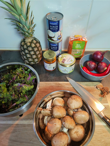 In einem großen Topf zwei EL Kokosöl zerlassen und die Zwiebeln, die Ananaswürfel mit 4 EL Currypaste darin für einige Minuten schmoren.