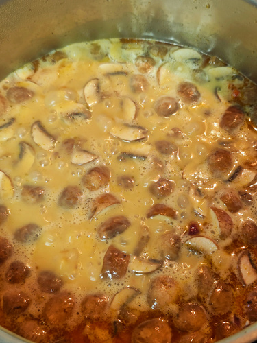 Die Linsen und Champignons dazu geben und für etwa 10 – 12 Minuten köcheln lassen bis die Linsen weich sind.