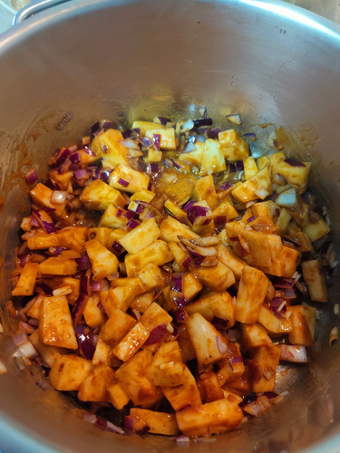 In einem großen Topf zwei EL Kokosöl zerlassen und die Zwiebeln, die Ananaswürfel mit 4 EL Currypaste darin für einige Minuten schmoren.