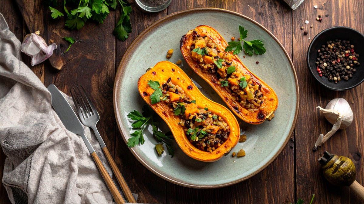 Die Kürbisse putzen, längs halbieren, die Kerne und Fasern entfernen und die Reismischung in die Kürbisse füllen. Die Semmelbrösel über den Reis verteilen und mit 1 EL Öl beträufeln.