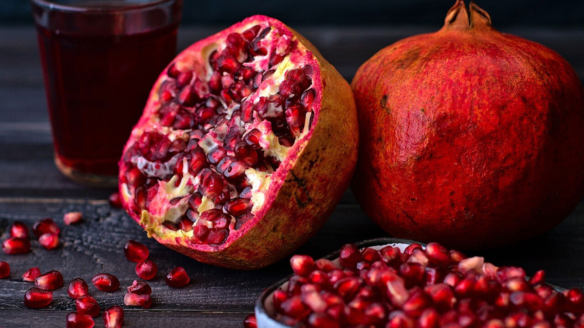 Granatäpfel halbieren. 3 Hälften mit einer großen Saftpresse auspressen (ergibt ca. 150 ml Saft). Orange heiß waschen, abtrocknen und die Hälfte der Schale dünn abschälen. Orange halbieren und auspressen.