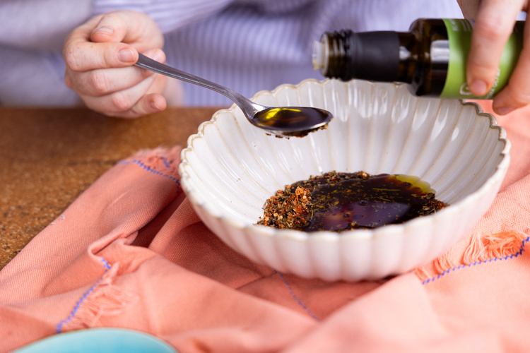 2. Eine Marinade aus Balsamico Creme, Olivenöl und Greek Grill anrühren.