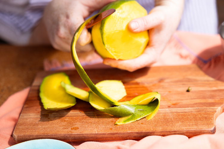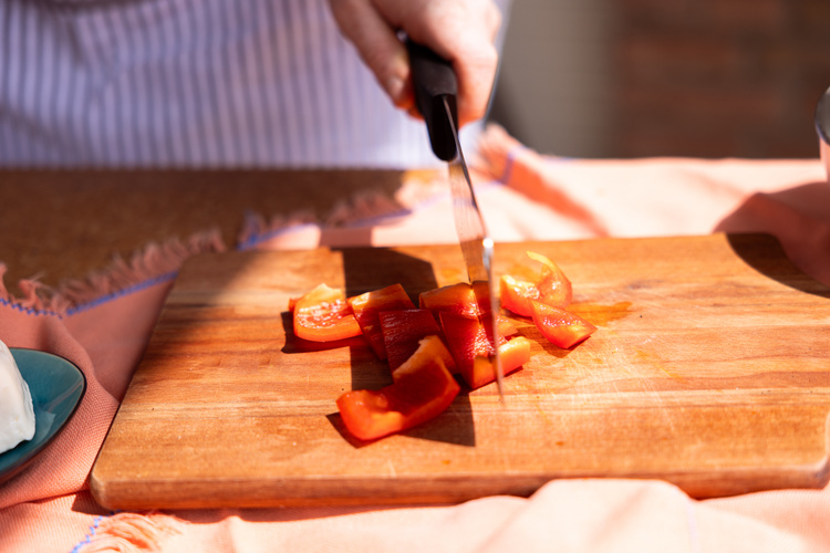 3. Dann die rote Paprika, Mango und den Halloumi in gleich große Würfel schneiden.