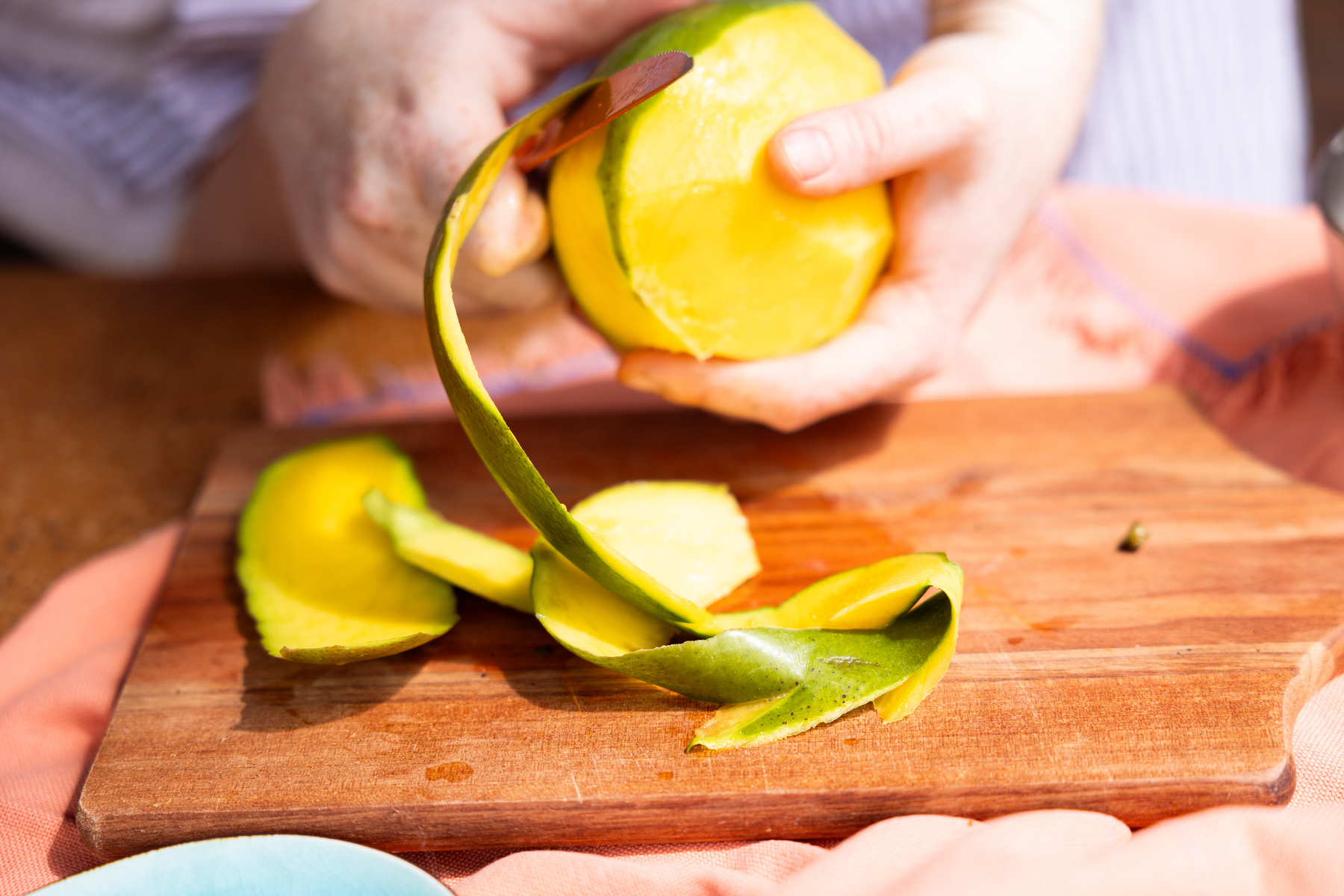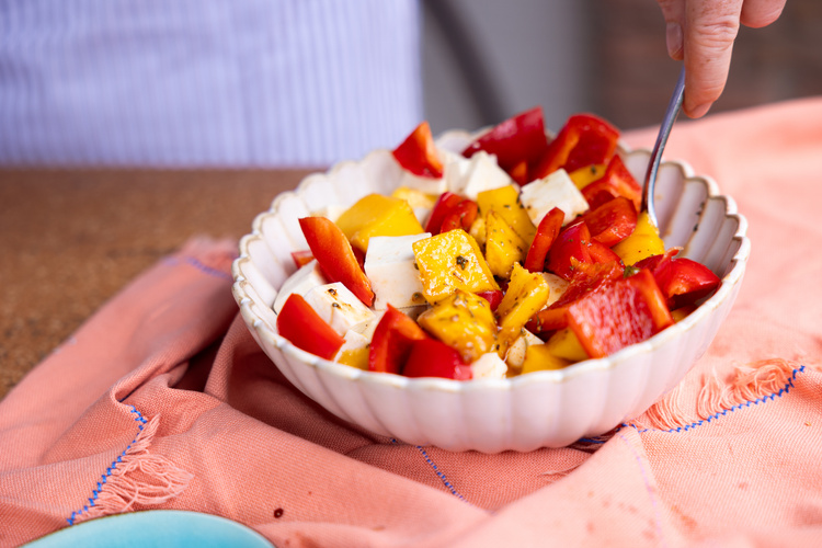 4. Die Paprika, Mango und Halloumi ca. 30 Minuten marinieren.