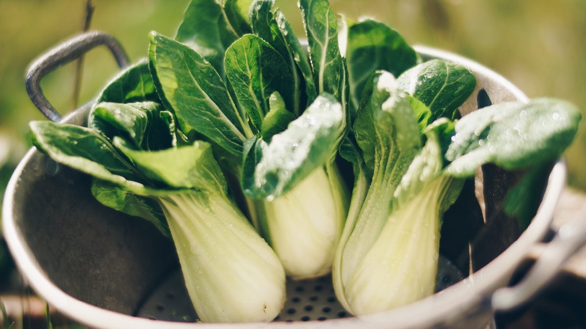 Olivenöl in einer Pfanne oder Wok erhitzen. Pak Choi, Möhren und Zwiebelringe zugeben und unter Rühren 3 - 4 Minuten garen. Herausnehmen und warm stellen.