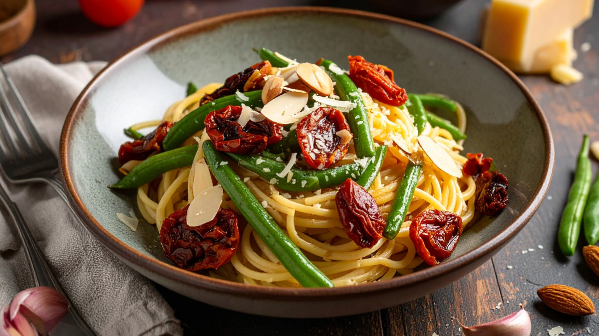 Getrocknete Tomaten in ca. 1 cm breite Streifen schneiden. Tomaten und grüne Bohnen zur Zwiebel-Knoblauchmischung geben und erwärmen.