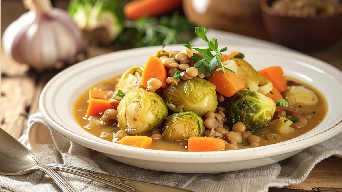 Währenddessen den Rosenkohl waschen und vierteln. Mit etwas Salz und Majoran in den Topf dazugeben und alles für weitere 15 Minuten bei mittlerer Hitze gar kochen.