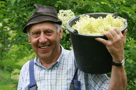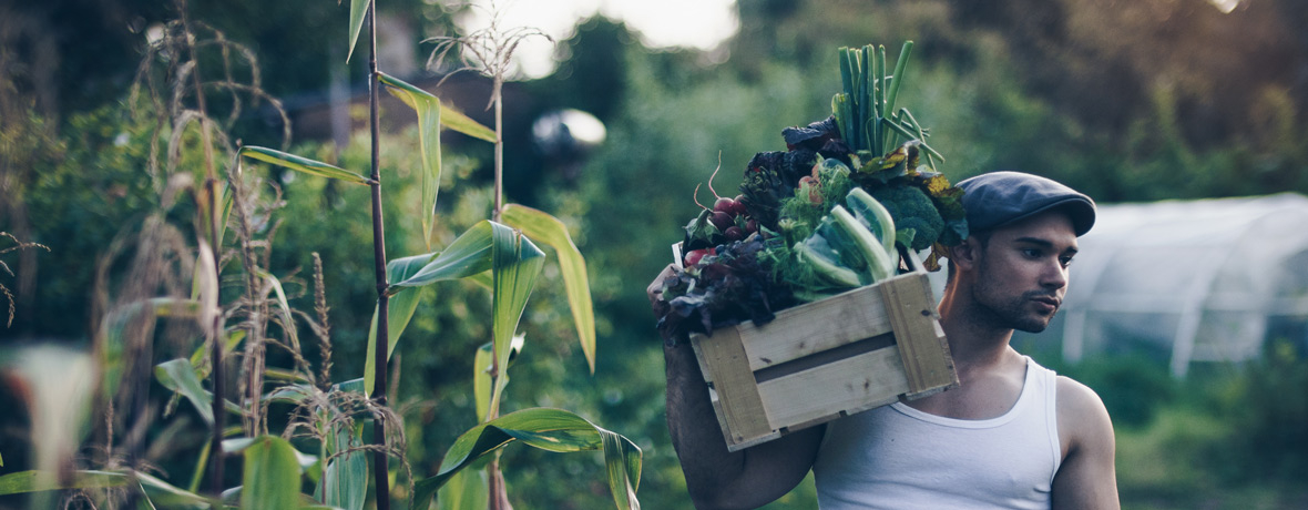 Grünland Gärtner Ernte Gemüse in Holzkiste auf Schulter